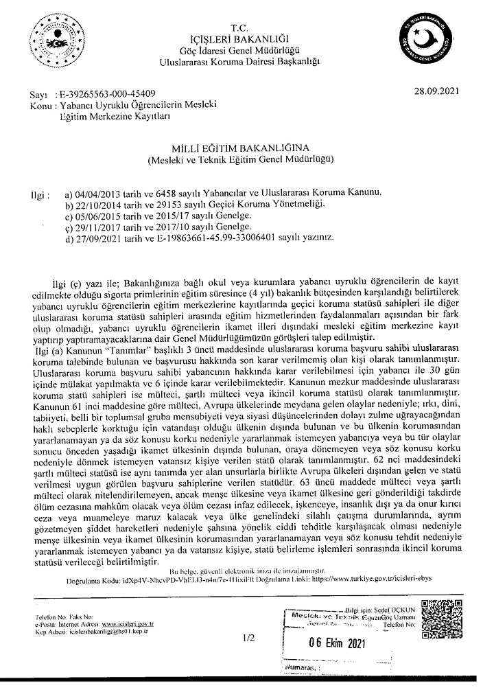 İlgi (d) yazı ile de ülkemizde bulunan ve geçici koruma statüsü verilen öğrencilerin mesleki eğitim merkezlerine kayıtlarında aranacak şartlar ve uygulanacak programlar belirlenmiştir. Ancak, geçici koruma statüsü verilen Suriye Arap Cumhuriyeti vatandaşları ile diğer koruma statülerine sahip yabancı uyrukluların ülkemizdeki eğitim hizmetlerinden yararlanma hakları konusunda tereddütler yaşanması nedeniyle İçişleri Bakanlığı Göç İdaresi Genel Müdürlüğünden görüş istenmiştir.