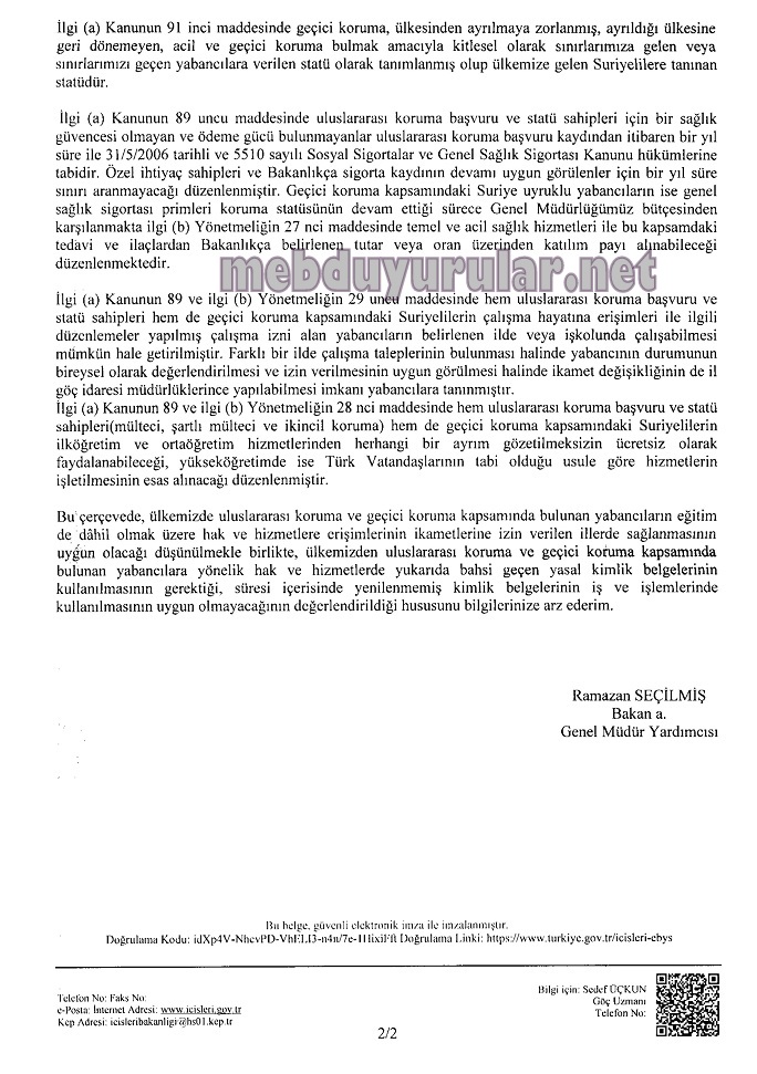 İçişleri Bakanlığı Göç İdaresi Genel Müdürlüğünün ilgi (ç) yazısında özetle; “İlgi (a) Kanunun 89 uncu ve ilgi (b) Yönetmeliğin 28 inci maddesinde, uluslararası koruma başvuru ve statü sahipleri (mülteci, şartlı mülteci, ikincil koruma) ile geçici koruma kapsamındaki Suriyelilerin ilköğretim ve ortaöğretim hizmetlerinden herhangi bir ayrım gözetmeksizin faydalanabileceği, ayrıca diğer hususlarda nasıl işlem yapılacağı” belirtilmiştir.